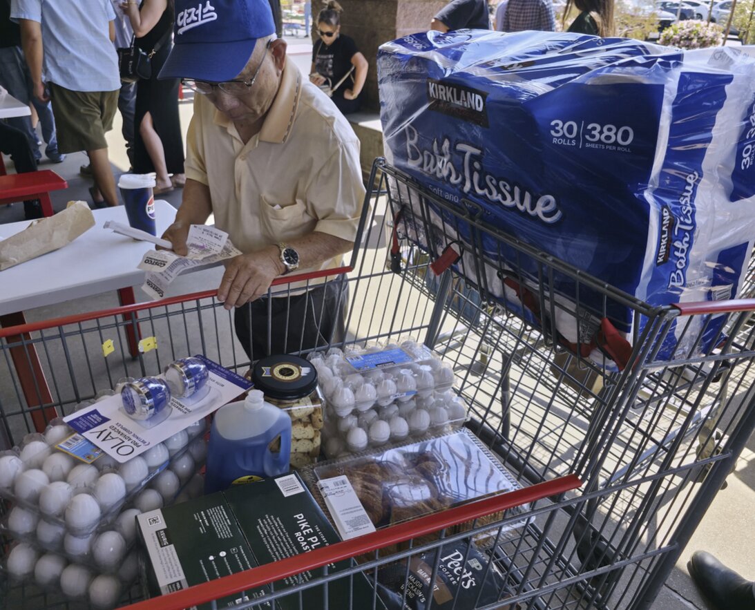 Một khách hàng kiểm tra hóa đơn mua sắm tại cửa hàng ở TP Glendale, bang California - Mỹ hôm 10-4 Ảnh: AP