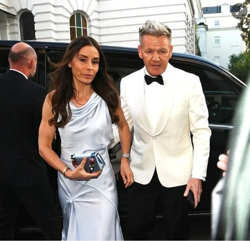 Đầu bếp Gordon Ramsay và vợ cùng tới dự tiệc sinh nhật Beckham. Ramsay đầy lịch lãm trong thiết kế tuxedo trắng và quần âu, trong khi bà xã Tana quyến rũ với lựa chọn đầm lụa xanh, kết hợp phụ kiện clutch cầm tay. Ảnh: Goffphotos.