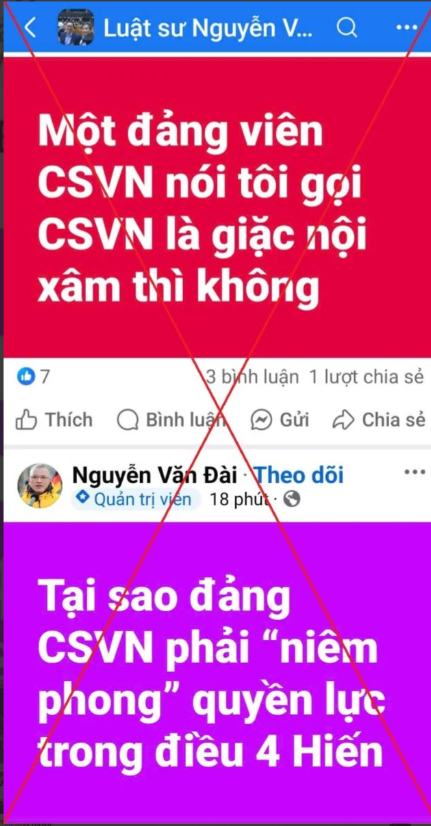 Nguyễn Văn Đài được xác định thường xuyên đăng tải, chia sẻ tin, bài có nội dung xuyên tạc sai sự thật, phỉ báng chế độ XHCN, tung tin bịa đặt nhằm lừa độc giả, gây hoang mang trong dư luận quần chúng…