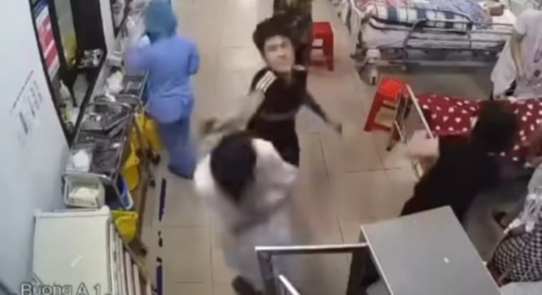 Mạng xã hội đang lan truyền video ghi lại sự việc nam thanh niên mặc áo đen có hành động đấm liên tiếp vào vùng đầu và mặt người mặc áo blouse tại một cơ sở y tế.