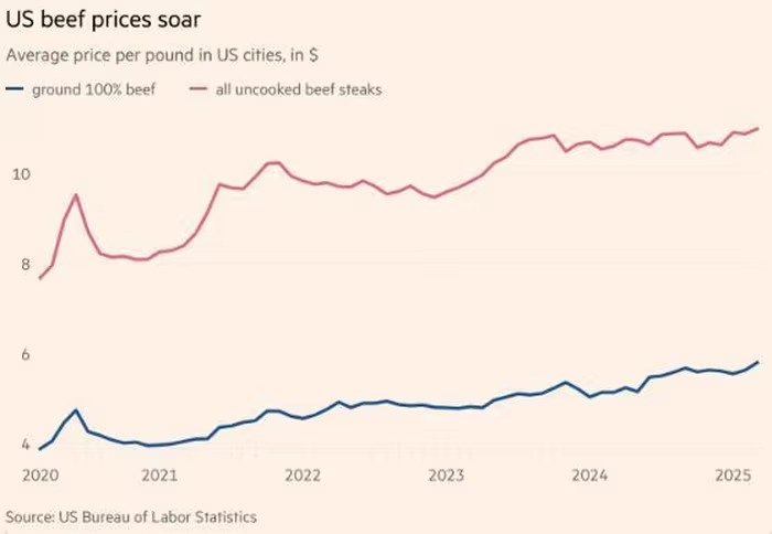 Theo dữ liệu của Bộ Lao động Mỹ, giá trung bình mỗi pound (0,454 kg) thịt bò xay đã tăng lên 5,79 USD tại các thành phố của Mỹ vào tháng 3, tăng 12,8% trong năm qua và là mức tăng cao nhất được ghi nhận.