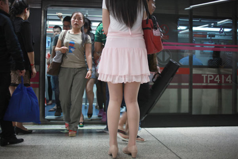 Một cô gái mặc váy ngắn bước lên tàu điện. Không còn chỗ ngồi, cô nhìn quanh.