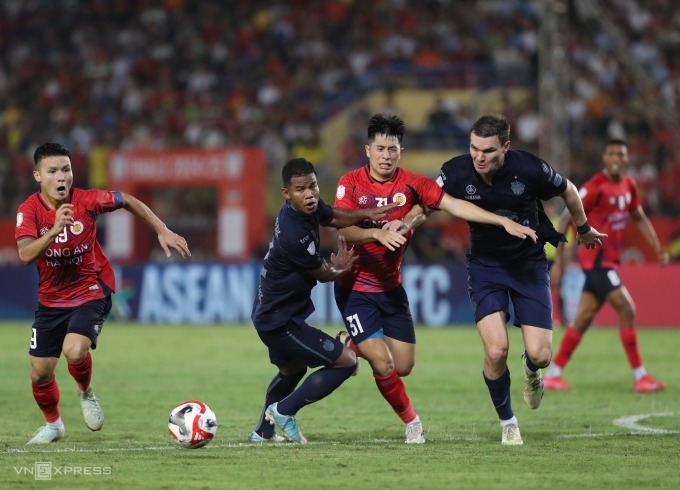 Công an Hà Nội (áo đỏ) hòa CLB Thái Lan Buriram United 2-2 ở lượt đi chung kết Cup CLB Đông Nam Á 2024-2025, trên sân Hàng Đẫy, Hà Nội ngày 14/5/2025. Ảnh: Hiếu Lương