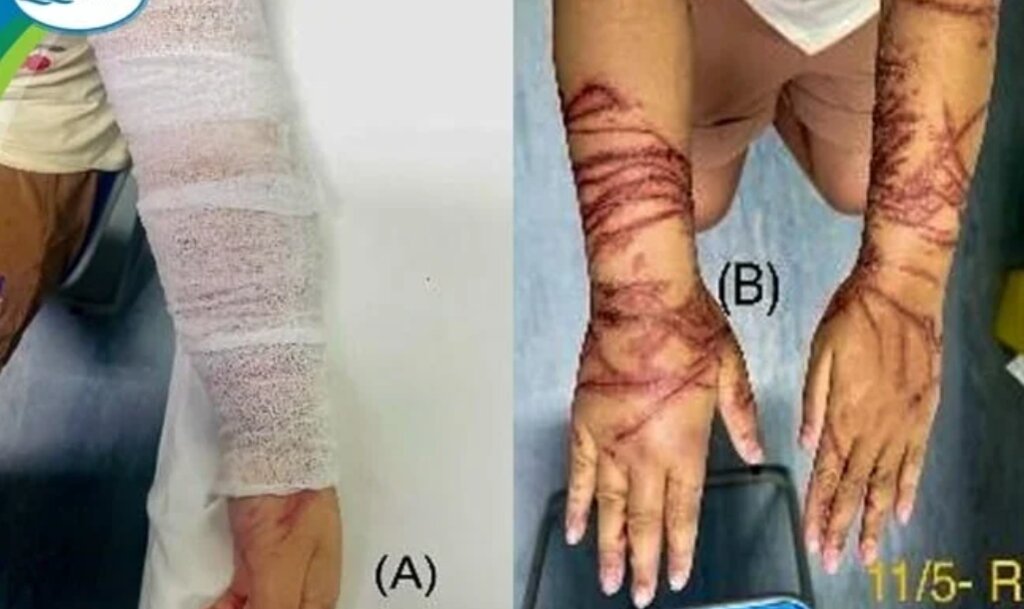 Tin từ Bệnh viện Nhi Trung ương cho biết, các bác sĩ khoa Da liễu của bệnh viện vừa tiếp nhận 1 bệnh nhi với đôi tay đầy những vết tổn thương da dài như "roi đánh", sẩn đỏ, phỏng nước.