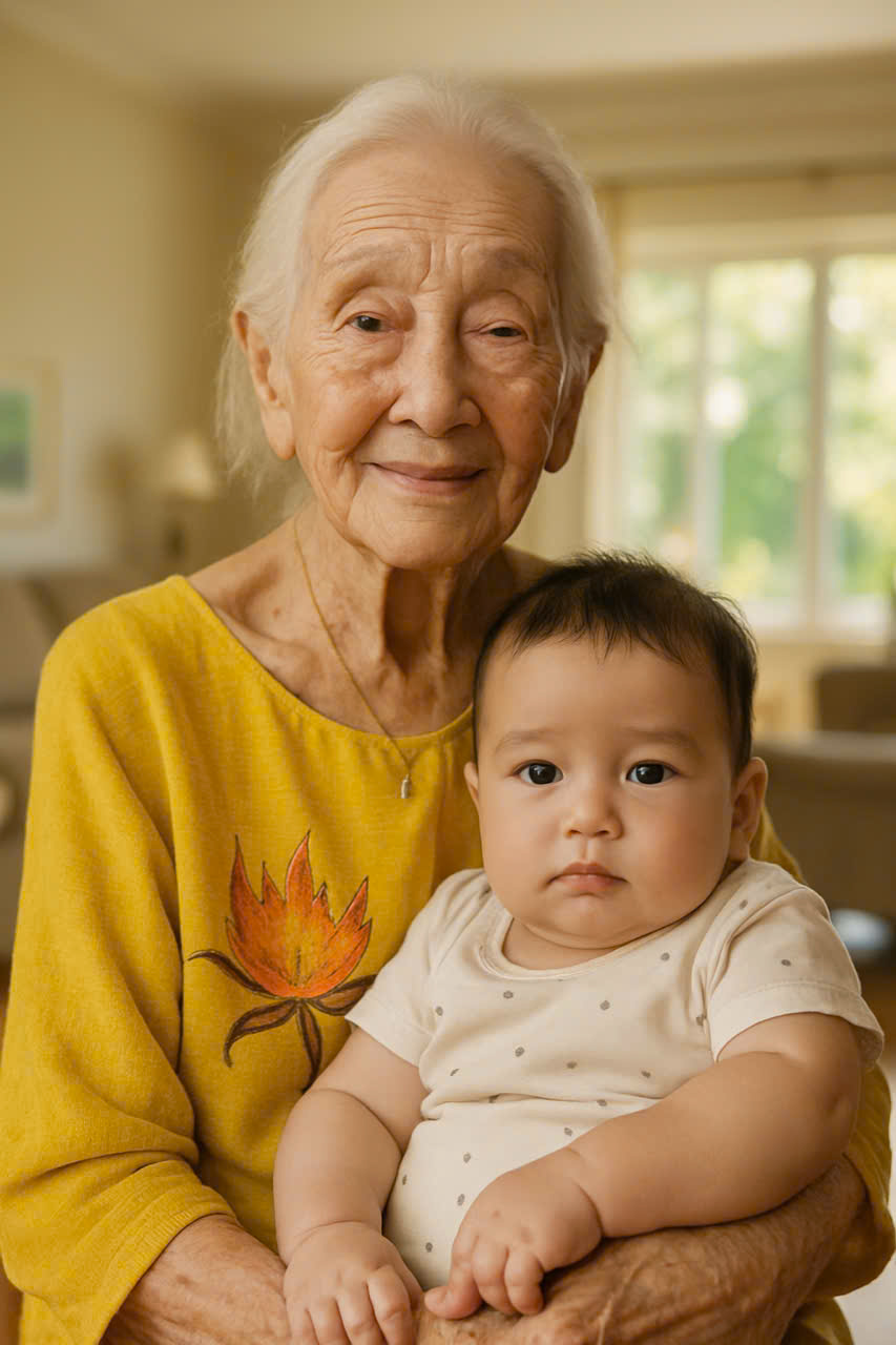 Buổi chiều, nắng rót vàng lên thềm. Bà ngồi trên chiếc ghế gỗ cũ, đôi mắt đục màu thời gian vẫn ánh lên niềm vui khi nhìn thấy đứa chắt nhỏ lẫm chẫm bước về phía mình.
