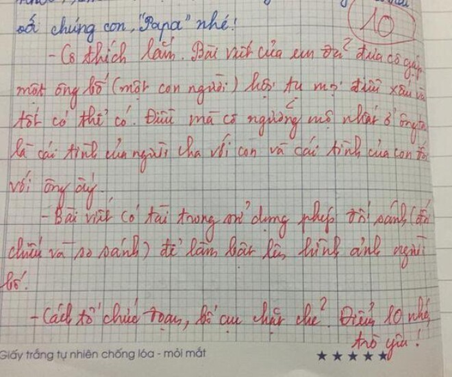 Bài văn dài hơn 2 mặt giấy của bé học sinh đã thực sự đưa người đọc đi từ cung bậc cảm xúc này đến cung bậc cảm xúc khác, nhưng nó quả thực đã để lại ấn tượng sâu sắc. Chính vì vậy nên cô giáo đã để lại những lời nhận xét “có cánh” cho đứa trẻ: “Cô thích lắm. Bài viết của em đã đưa cô gặp một ông bố (một con người) hội tụ mọi điều tốt và xấu có thể có. Điều mà cô ngưỡng mộ nhất ở ông ta là cái tình của người cha đối với con và cái tình của con đối với ông ấy".