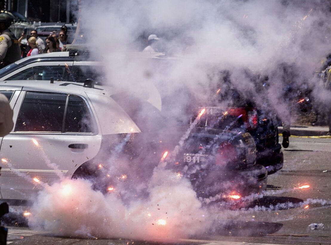 Người biểu tình ném pháo hoa vào xe cảnh sát ở Paramount, California. Ảnh: Reuters
