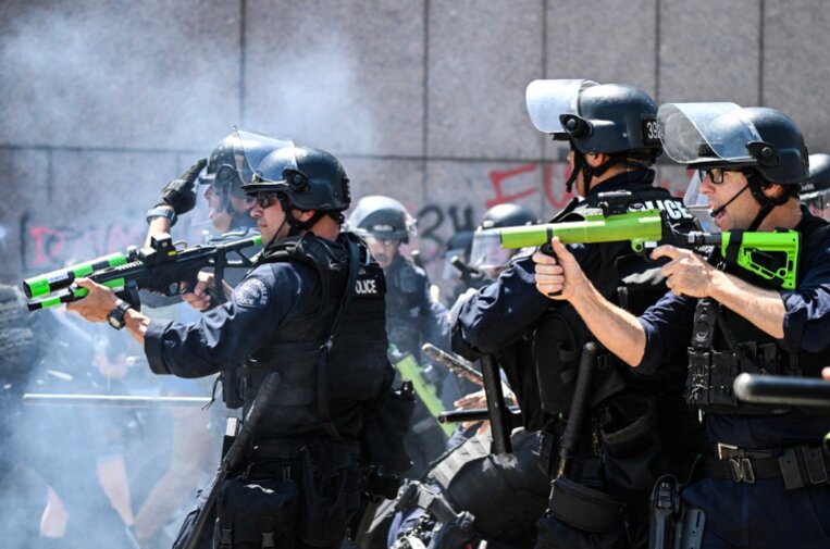 Cảnh sát Los Angeles ứng phó người biểu tình bên ngoài một tòa nhà liên bang hôm 10/6. Ảnh: AFP