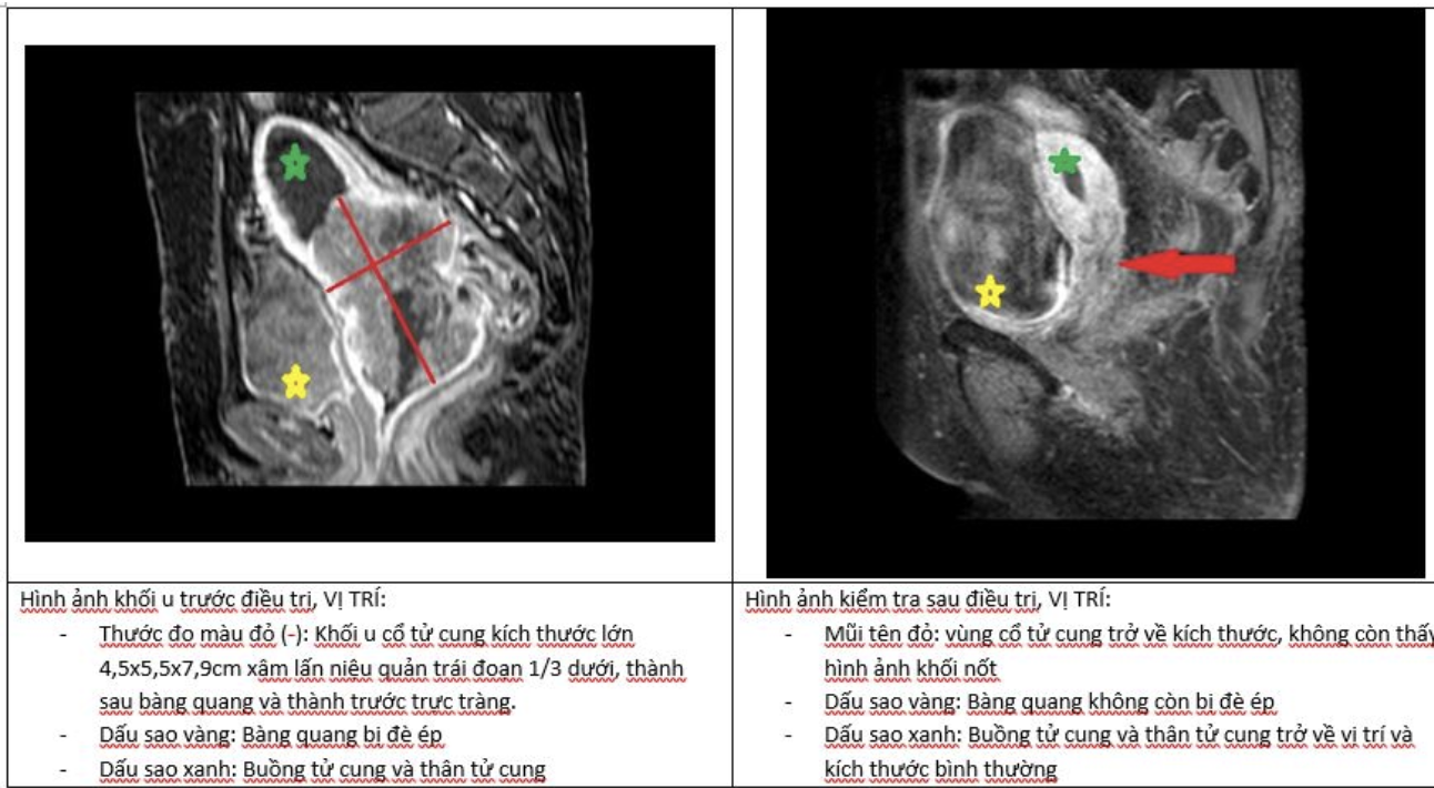 Bác sĩ Duy Anh cho biết điều trị ung thư cổ tử cung giai đoạn muộn không chỉ đối mặt với khối u chính. Trong trường hợp của bệnh nhân này, khối u đă xâm lấn vào niệu quản trái, gây tắc nghẽn và giăn toàn bộ hệ tiết niệu bên trái, dẫn đến nguy cơ suy thận nếu không được xử lư kịp thời.
