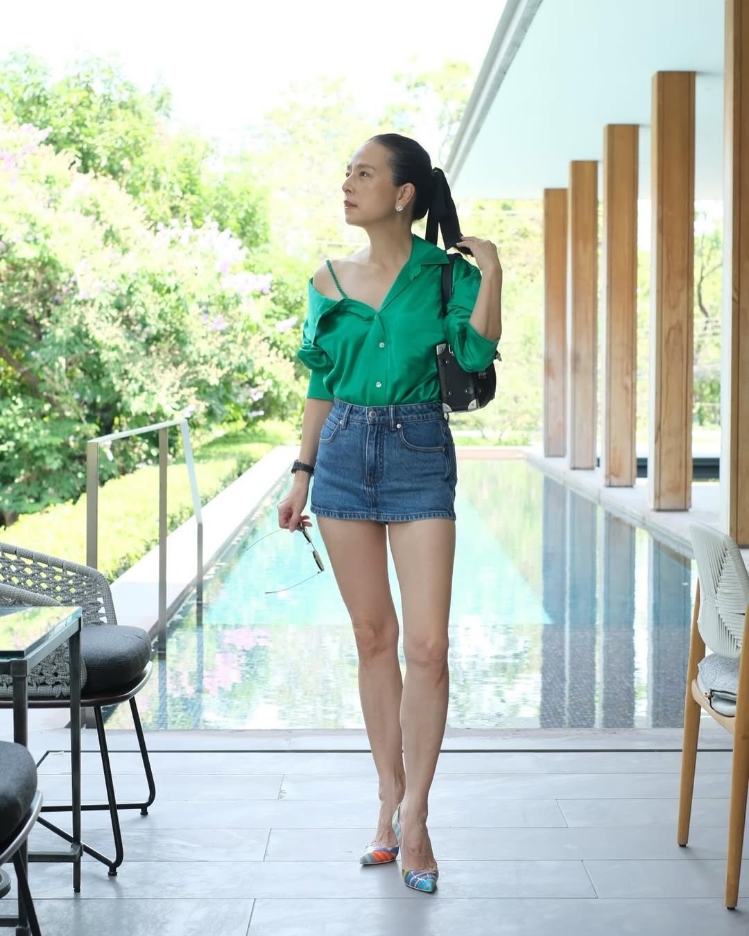 Tại một khu nghỉ dưỡng, bà lăng xê mốt váy siêu ngắn đang hot trên thế giới với thiết kế denim, kết hợp sơ mi lệch vai và giày cao gót.