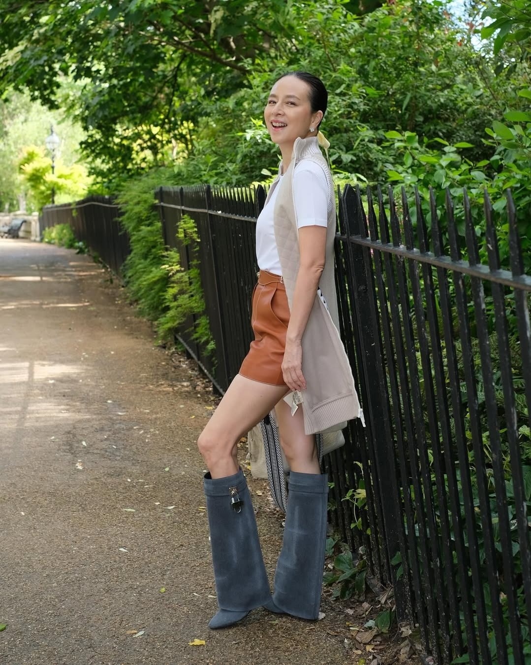 Quần shorts cũng là món đồ yêu thích giúp bà trông trẻ hơn. Bà thường kết hợp chúng với bốt hàng hiệu, trong đó có thiết kế của Givenchy, Saint Laurent.
