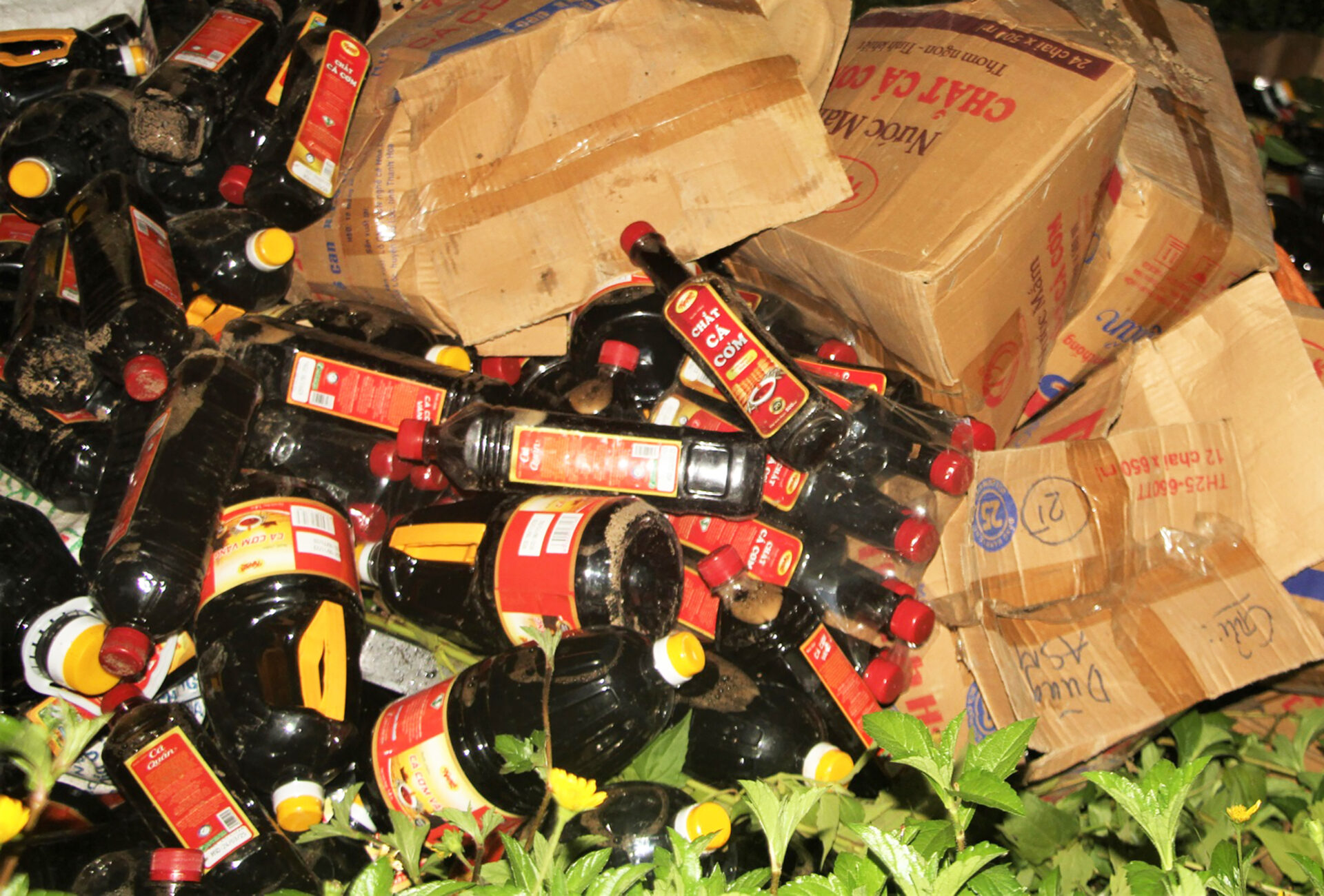 Hai ngày trước, cả ngàn chai nước mắm "Chắt Cá Cơm", "Cá Cơm Vàng" còn nguyên bao bì và nhãn hiệu bị vứt bỏ trên bờ kênh Phú Ninh, Quảng Nam.