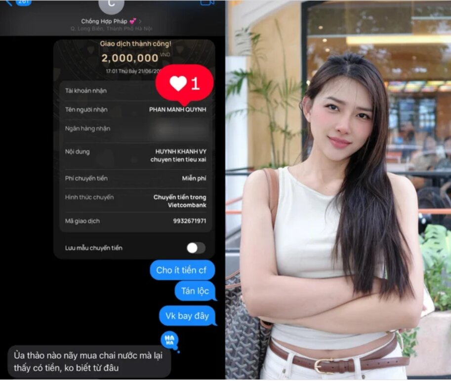 Khánh Vy tiết lộ số dư tài khoản hiện tại của Phan Mạnh Quỳnh chỉ còn 92 nghìn đồng. Vì vậy, cô đã chuyển thêm 2 triệu đồng cho chồng. (Ảnh: FBNV)