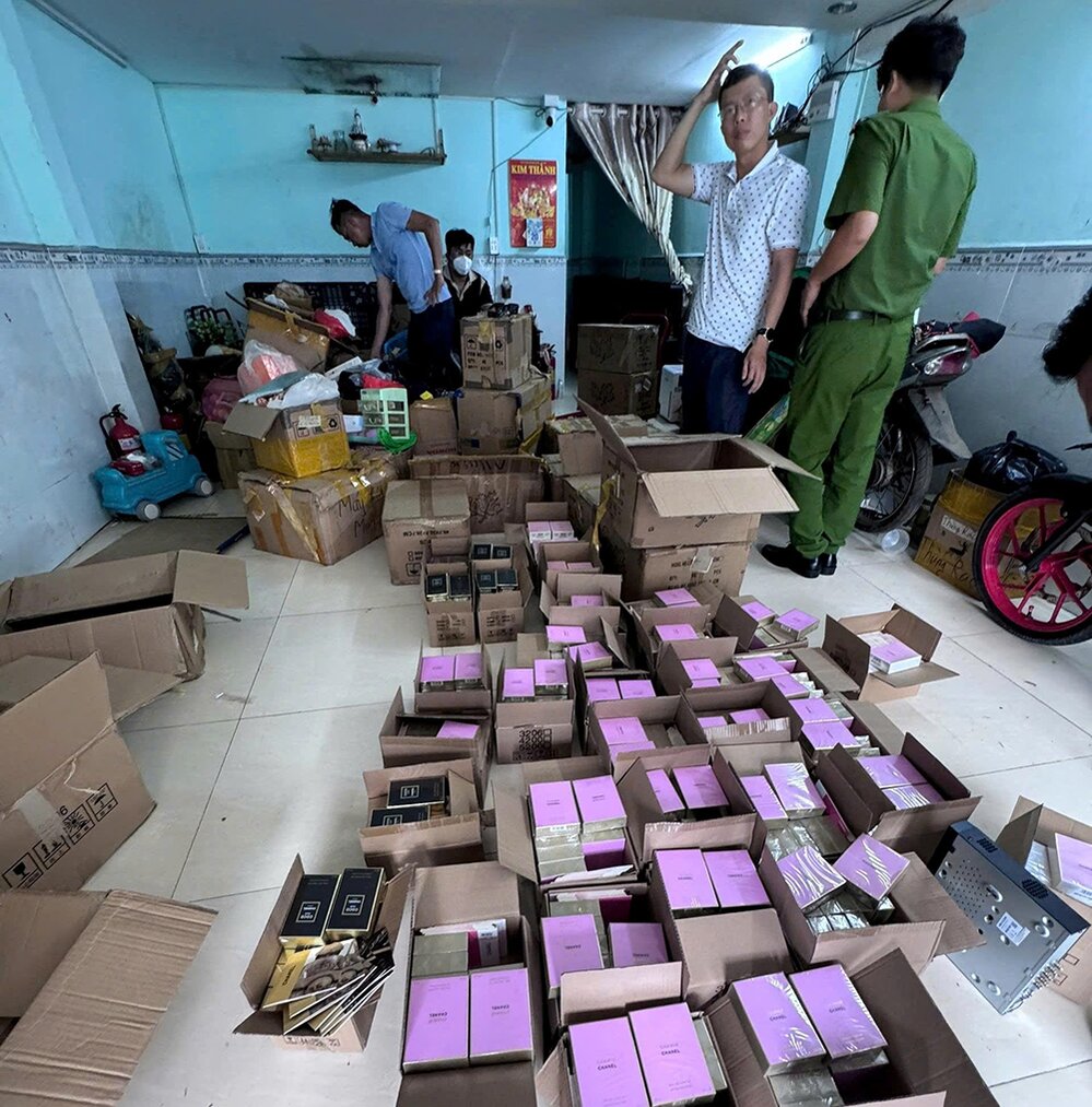 Công an TPHCM xác định nhóm này mua hàng nguồn gốc từ Trung Quốc về, giả nước hoa các thương hiệu như: Chanel, Dior, Bvlgari… bán trên mạng. Khám xét các nhà kho, công an thu giữ 10.000 chai nước hoa.