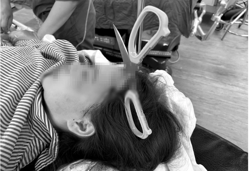 Nữ bệnh nhân 25 tuổi nhập viện trong tình trạng có vết thương sưng nề vùng thái dương trái do lưỡi kéo sắc nhọn găm sâu vào hộp sọ.