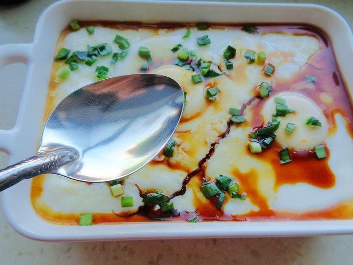 Bước 3: Cho nước vào nồi hấp, đun sôi nước rồi đặt thố nguyên liệu lên xửng. Thời gian hấp món ăn này trong khoảng 12-15 phút ở mức lửa lớn. Nếu bạn thích ăn trứng trên bề mặt mềm dạng lòng đào thì có thể rút ngắn thời gian hấp. Ngược lại nếu bạn muốn trứng chín kỹ thì có thể thăng thêm 2 phút hấp. Thêm nước vào nồi hấp, thêm trứng luộc và đậu phụ, hấp ở lửa lớn trong 12 phút. Sau khi món ăn chín, bạn lấy ra khỏi nồi, thêm nước tương và dầu hào vào rồi rắc hành lá xắt nhỏ lên trên là món ăn hoàn thành.