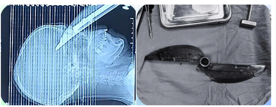 Hình ảnh chụp chiếu cho thấy lưỡi dao máy cắt cắm sâu hộp sọ khoảng 10cm. Ảnh: BVCC