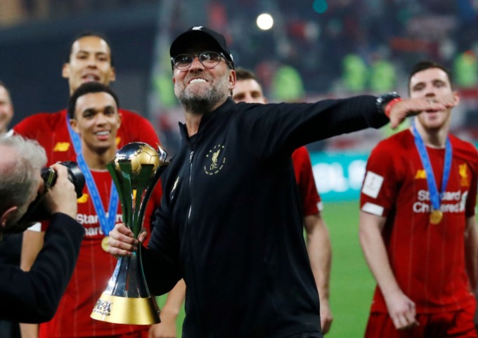 Jurgen Klopp mừng chức vô địch FIFA Club World Cup, sau khi cùng Liverpool thắng Flamengo ở chung kết trên sân vận động quốc tế Khalifa, Doha ngày 21/12/2019. Ảnh: Reuters
