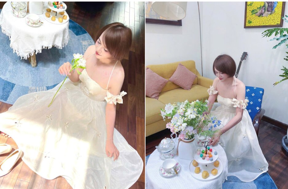 Sáng tháng 6 đầy nắng, chị Tiên Lê (tên thường gọi là Thủy Tiên, 42 tuổi, Đà Nẵng) chọn một bộ váy đẹp, trang điểm nhẹ nhàng rồi đến tiệm trà nhỏ của mình tại quận Liên Chiểu, Đà Nẵng để tiếp đón các vị khách đến thử váy, uống trà và nghe nhạc.