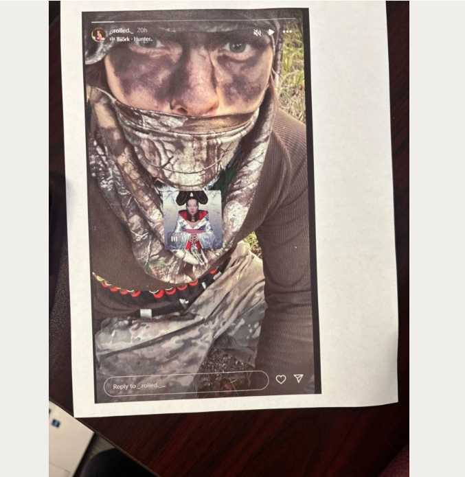 Roley trước đó đăng một bức ảnh lên Instagram cá nhân, trong đó nghi phạm đang quỳ gối hoặc ngồi, mặc đồ ngụy trang tối màu, che mặt và dường như có mang đạn. Hình ảnh này hiện không còn tồn tại.
