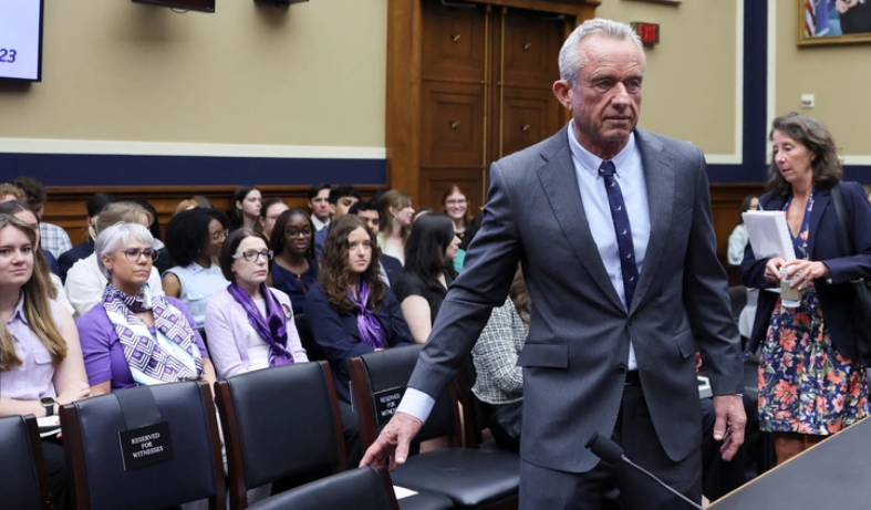 Những người phụ nữ mang khăn choàng màu tím nhằm ủng hộ Hiệp hội Alzheimer ngồi phía sau Bộ trưởng Y tế và Dịch vụ nhân sinh Mỹ (HHS) Robert F. Kennedy Jr., khi ông tham dự buổi điều trần tại Đồi Capitol, Washington D.C hôm 24-6 - Ảnh: REUTERS