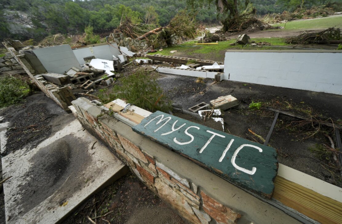 Biển hiệu trại Mystic gần lối vào cơ sở này sau khi một trận lũ quét tràn qua khu vực ở thị trấn Hunt, bang Texas. Ảnh AP