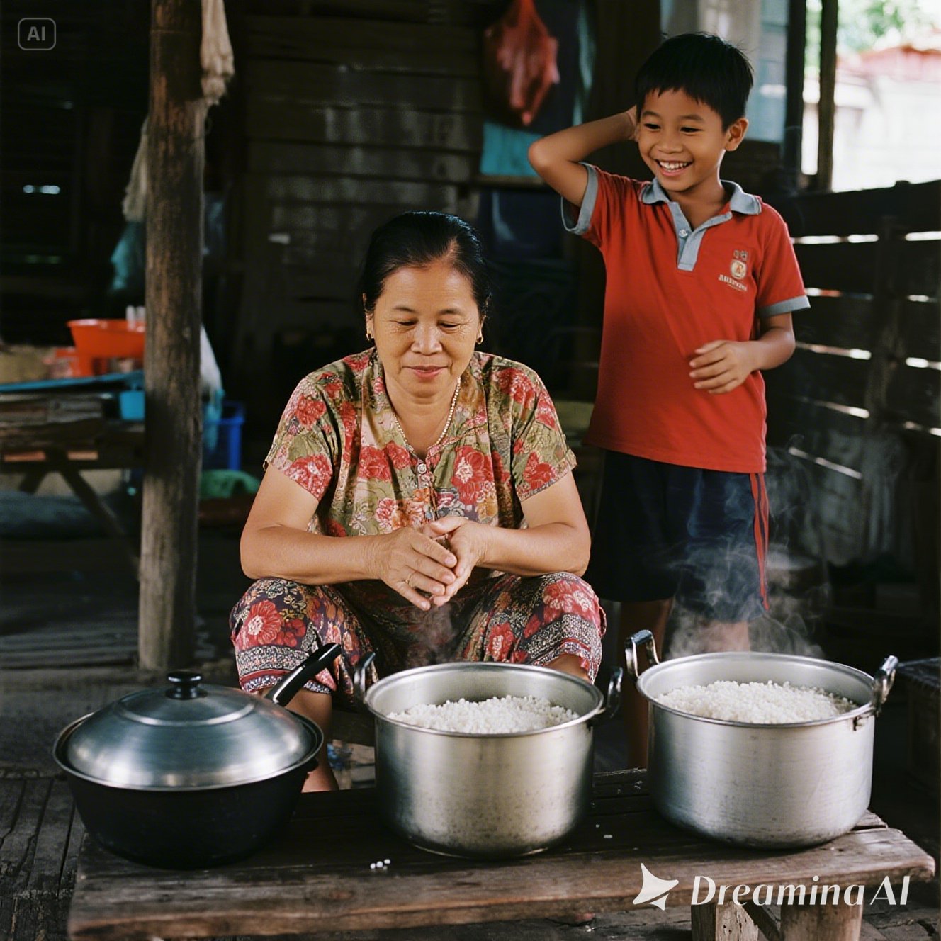 Nửa tiếng sau, lại thấy bà xới gạo nấu cơm nữa.