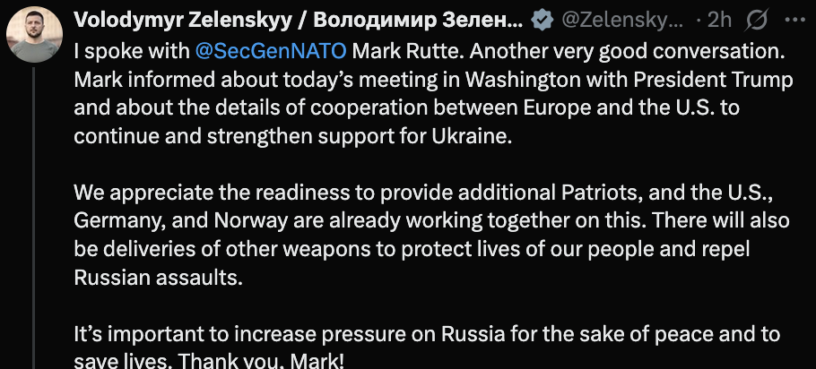 Bài đăng trên mạng xã hội X của Tổng thống Ukraine Volodymyr Zelensky về cuộc điện đàm với Tổng Thư ký NATO Mark Rutte. Ảnh chụp màn hình