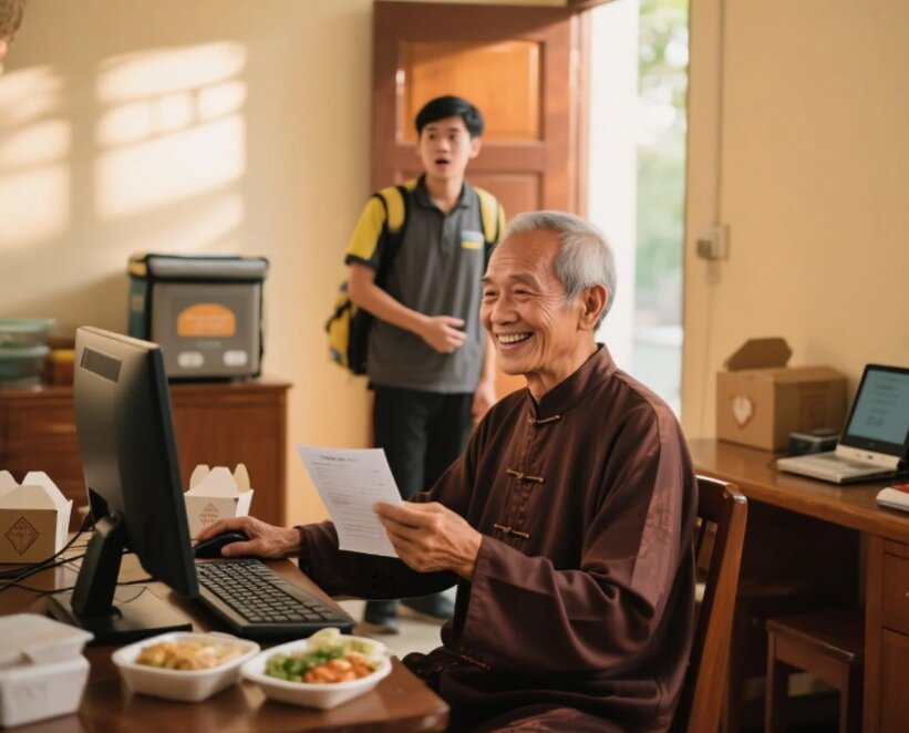 Cụ ông tên Thi, năm nay 83 tuổi, mắt hơi mờ, tay run nhẹ… nhưng cực mê mua hàng online. Một ngày, cụ gọi shipper: