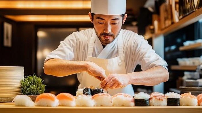 Ba đầu bếp đang cắt những lát cá ngừ và cá hồi đắt tiền tươi rói, trong lúc hai người khác dùng tay nặn những nắm cơm tròn hoàn hảo. Một đầu bếp khác, với cây đèn khò đang nướng từng lát cá ngừ nằm trên nắm cơm, biến miếng cá từ màu hồng sang nâu vàng dưới ngọn lửa.