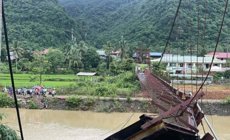 Cầu treo Pa Thơm (xã Thanh Yên, tỉnh Điện Biên) bị đứt cáp khiến ô tô bán tải chở cán bộ xã đi kiểm tra chống bão và một xe máy rơi xuống sông.
