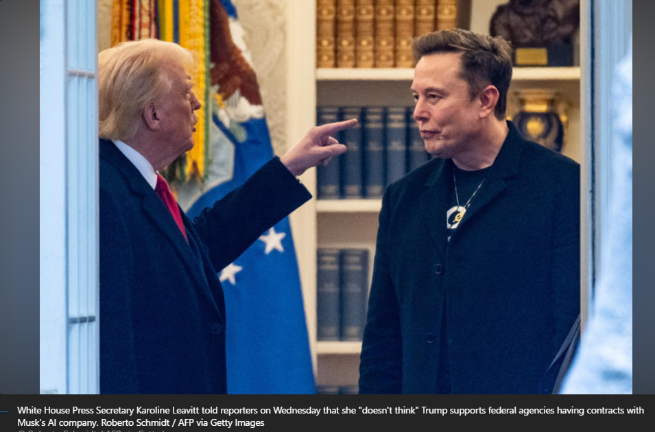 Khi Thư ký Báo chí Nhà Trắng Karoline Leavitt được một phóng viên hỏi hôm thứ Tư rằng liệu tổng thống có ủng hộ các cơ quan liên bang ký hợp đồng với xAI của Musk hay không, bà trả lời rằng ông không ủng hộ.
