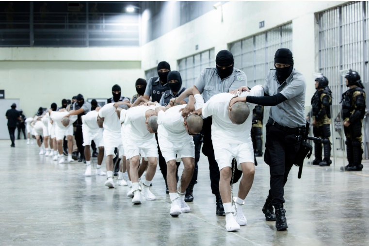Những người bị trục xuất khỏi Mỹ bị áp giải vào nhà tù CECOT tại Tecoluca, El Salvador ngày 16/3. Ảnh: AP