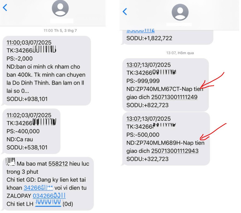 Theo nội dung tin nhắn SMS từ ngân hàng, tài khoản này đang được liên kết với ví điện tử ZaloPay, trong khi ví điện tử này lại được đăng ký bởi chính số điện thoại của chị.