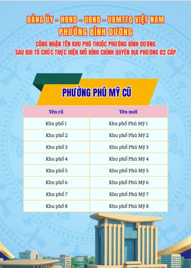 Tại buổi lễ, phường Bình Dương đã công bố Nghị quyết công nhận việc đổi tên 17/20 khu phố trực thuộc phường. Địa phương này có 20 khu phố, trong đó, có 3 khu phố vẫn giữ nguyên tên cũ do không trùng lắp, 17 khu phố trùng lắp tên sau sáp nhập, thành lập mới phường Bình Dương.