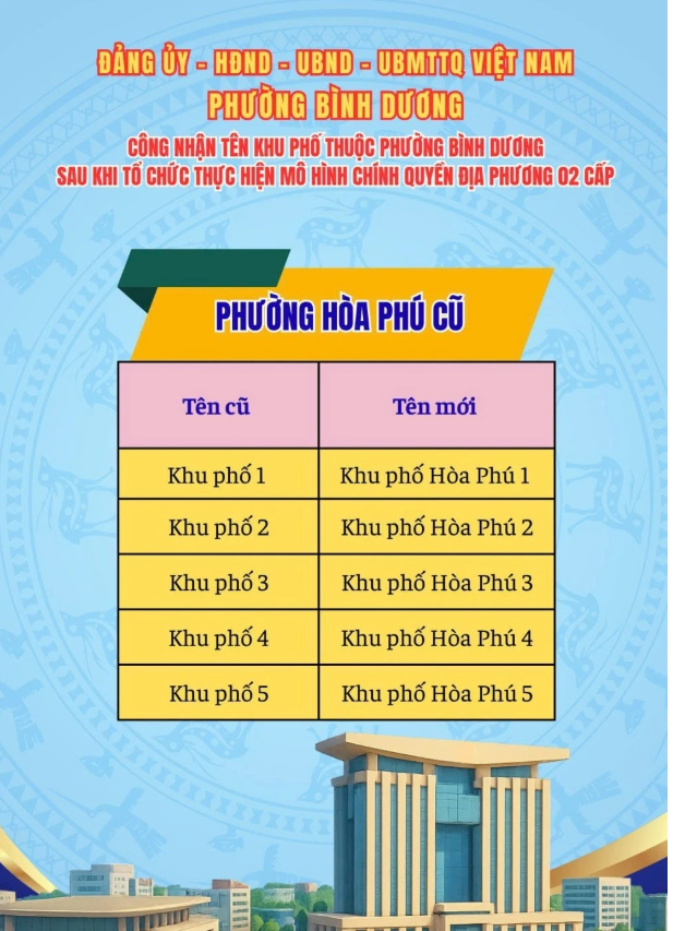 Tên khu phố mới và cũ khu vực phường Hòa Phú trước sáp nhập.