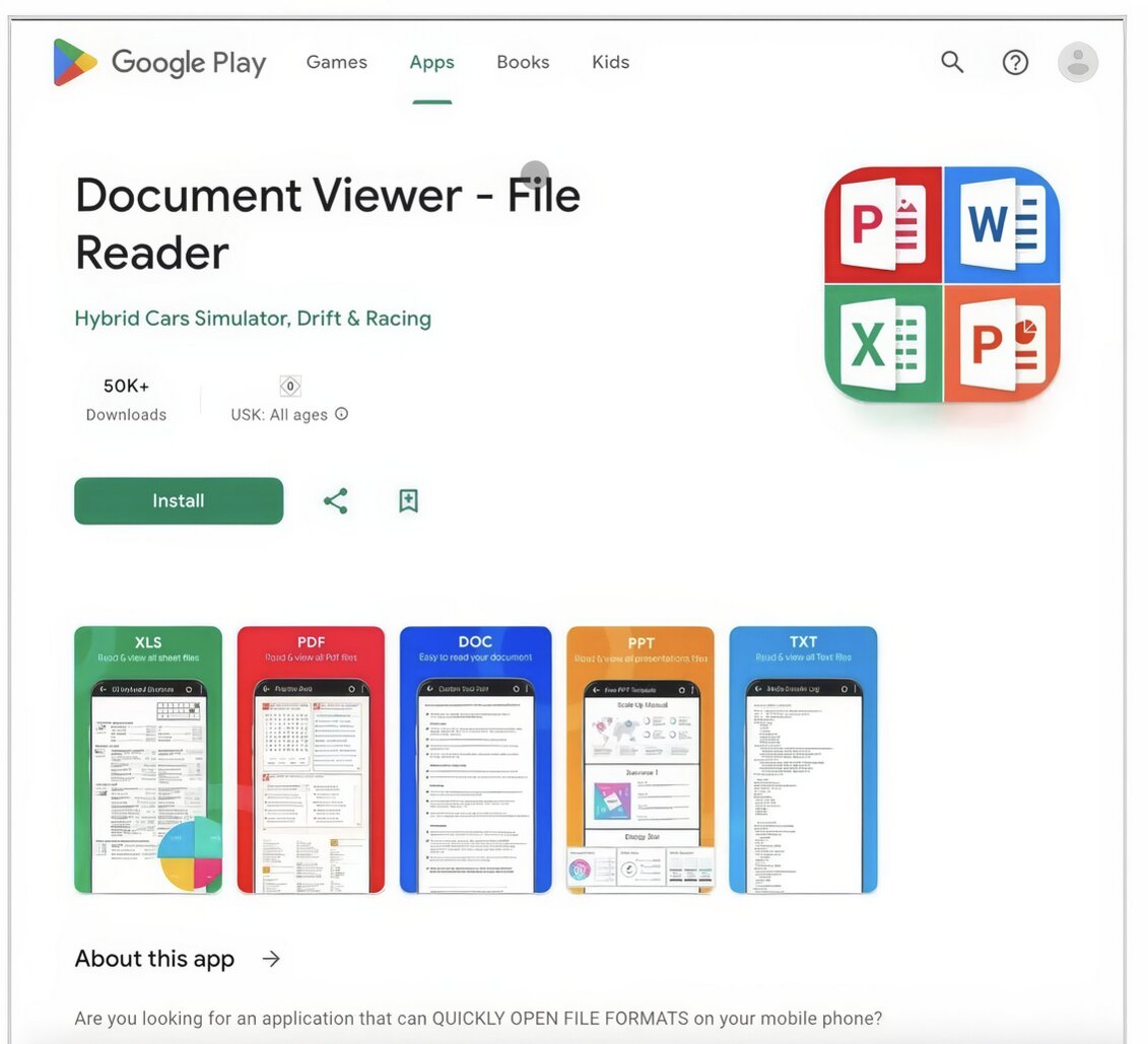 Ứng dụng cài cắm mã độc có tên Document Viewer - File Reader. Hiện tại, Google đã gỡ bỏ Document Viewer - File Reader khỏi kho ứng dụng và cam kết cập nhật hệ thống Play Protect để ngăn ngừa tái nhiễm. Tuy nhiên, nếu bạn đã từng tải ứng dụng này, cần xóa ngay lập tức, kiểm tra lại toàn bộ tài khoản ngân hàng và đổi mật khẩu liên quan để đảm bảo an toàn.