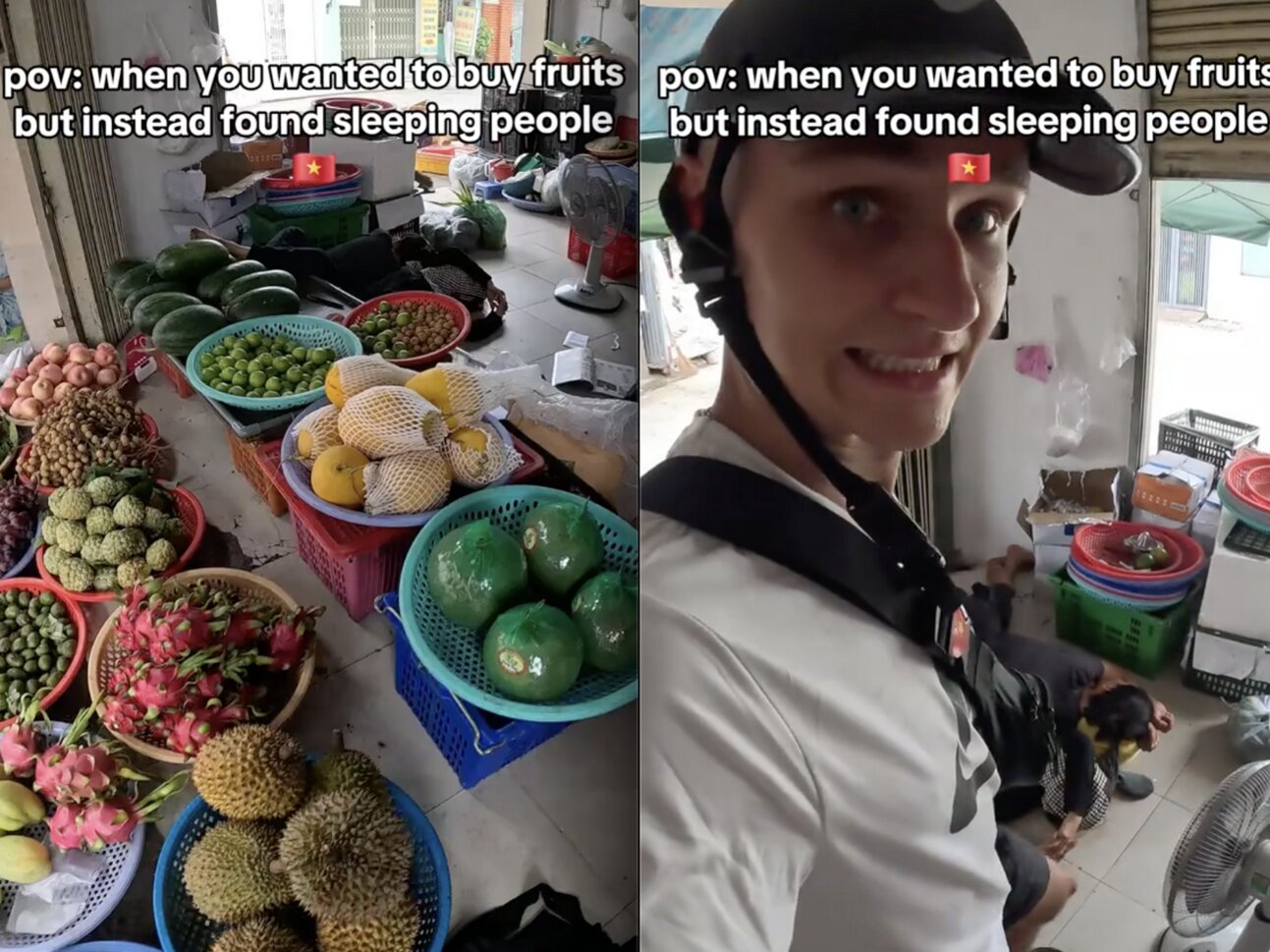Trong video, anh ghé vào một quầy trái cây bên lề đường vào khoảng buổi trưa. Điều thú vị là toàn bộ những người bán hàng ở đó đều… đang ngủ say. Hai người lớn nằm ngủ phía sau quầy, trong khi một cô bé nhỏ tuổi đang ngồi học bài bên cạnh - có vẻ là con hoặc cháu của chủ hàng. Không một ai ra chào hay hỏi han như thường thấy. Nhưng thay vì bối rối hay bỏ đi, anh Tây lại tỏ ra vô cùng điềm tĩnh, như thể đã quá quen với "đặc sản buổi trưa" này.