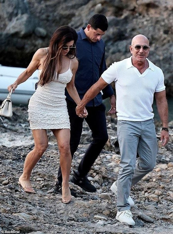 Lauren nổi bật với chiếc váy màu kem, với phụ kiện túi xách cùng màu và đeo kính râm. Trong khi, chủ tịch điều hành Amazon chọn trang phục đơn giản gồm áo polo trắng, quần xám và giày thể thao.