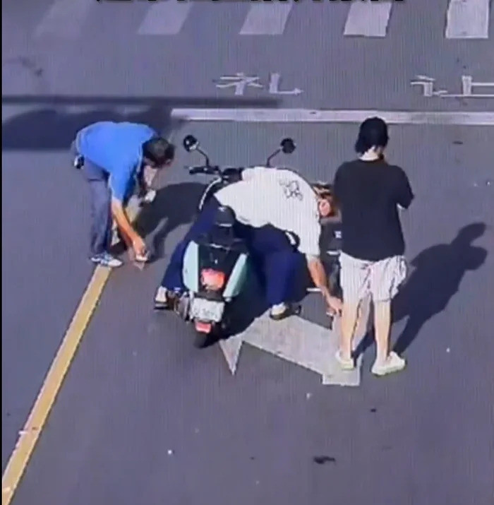 Một cặp đôi trẻ đi xe máy tới, lập tức cúi xuống nhặt số tiền. Nhiều người cũng tới giúp đỡ, rồi gom lại đưa cho chàng trai lái xe máy.