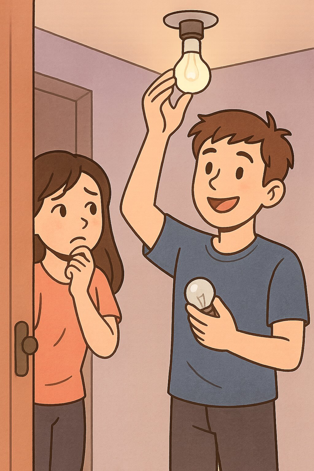 – Anh ơi, bóng đèn phòng em bị hỏng, anh giúp em thay được không?