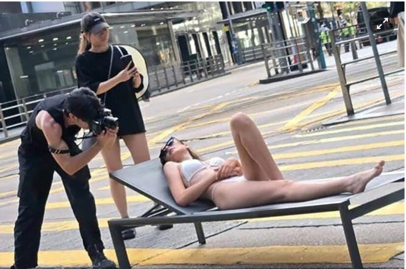Sáng 8/8, người dùng mạng xã hội Threads “Convoy_wolf” đăng tải 2 bức ảnh chụp cảnh tượng lạ mắt: một người phụ nữ mặc bikini trắng nằm trên ghế dài đặt ngay giữa lối sang đường trên phố Pedder ở trung tâm Hong Kong. Xung quanh cô, một nhóm nhiếp ảnh gia liên tục chụp hình, theo SCMP.