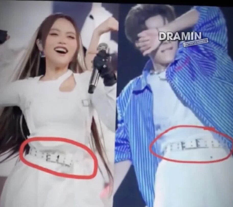 Theo những "bằng chứng" được lan truyền trên mạng xã hội, Quang Hùng MasterD và Phương Mỹ Chi được cho là nhiều lần sử dụng những món đồ giống hệt nhau. Điển hình là mẫu thắt lưng trắng bản to gắn hàng lỗ kim loại, vừa xuất hiện trên sân khấu biểu diễn vừa xuất hiện trong các bộ outfit streetstyle. Đáng chú ý, cặp dây chuyền ngọc trai phối charm bạc cũng được check là xuất hiện ở cả Quang Hùng MasterD lẫn Phương Mỹ Chi, trông chẳng khác gì phụ kiện đồ đôi được lựa chọn có chủ ý.