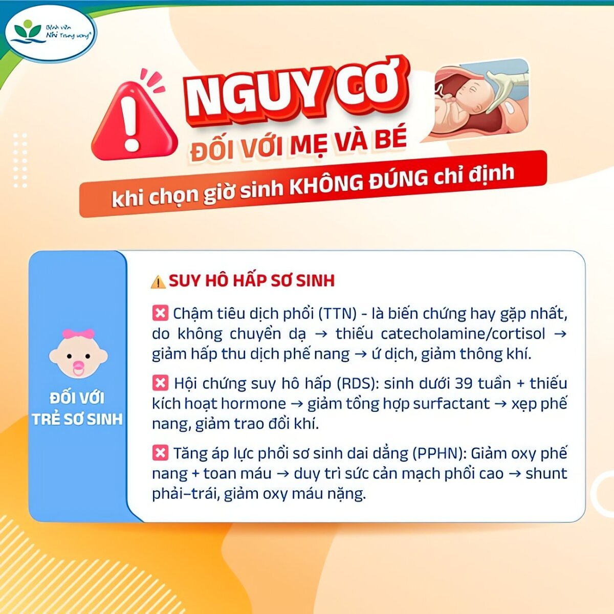 Theo đó, một trẻ sơ sinh hai ngày tuổi, được mổ lấy thai ở tuần 37 theo yêu cầu của gia đình để “chọn ngày giờ đẹp”. Ngay sau sinh, trẻ có biểu hiện suy hô hấp, phải thở oxy và chuyển viện khẩn cấp.