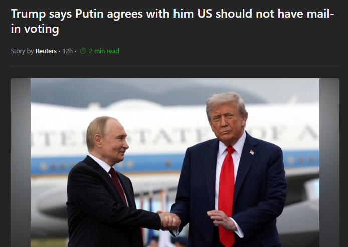 "Vladimir Putin, một người thông minh, đã nói rằng không thể có một cuộc bầu cử trung thực nếu bỏ phiếu qua thư", Trump nói với chương trình "Hannity" của Fox News Channel sau cuộc họp gần ba giờ giữa hai nhà lãnh đạo tại Alaska. "Ông ấy nói rằng hiện không có quốc gia nào trên thế giới sử dụng hình thức này."