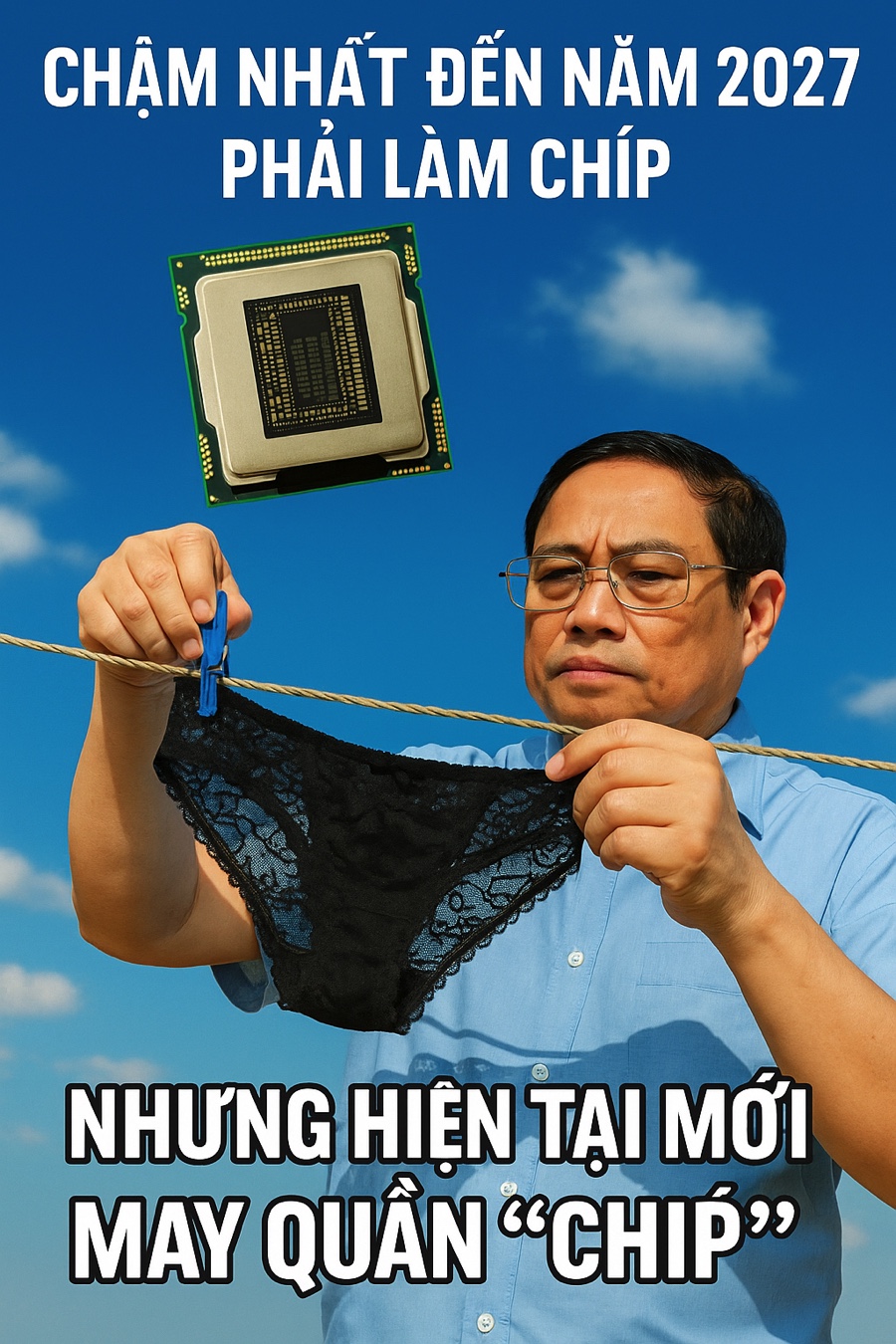 Đúng là “chip” cũng quan trọng, nhưng khi dân nghe Thủ tướng nói về “chế tạo chip” mà chỉ nghĩ ngay đến “may quần chíp”, thì ấy là do niềm tin đã tụt xuống mức… nội y. Căn bệnh kinh niên: lãnh đạo Việt Nam thích nổ Phát biểu của Thủ tướng Chính không phải cá biệt. Nó là một tập quán: Hôm qua thì: “Việt Nam thành trung tâm tài chính khu vực.” Hôm kia thì: “Việt Nam làm trung tâm hòa giải quốc tế.” Hôm nay thì: “Năm 2027 sản xuất chip bán dẫn.” Ngày mai, biết đâu lại đến: “Năm 2030 Việt Nam sản xuất… tàu vũ trụ.”