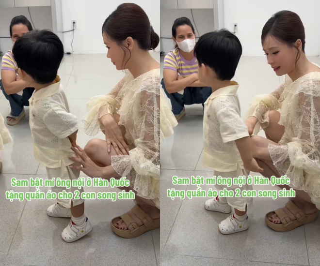 Mới đây, Sam gây chú ý khi hiếm hoi nhắc về gia đình chồng. Theo đó, trong lúc chơi đùa với 2 con song sinh trong hậu trường, người đẹp đã khoe Ijin - Ijun diện quần áo do ông nội gửi tặng. Sam chia sẻ: "Bộ đồ này do ông nội ở Hàn Quốc mua tặng".