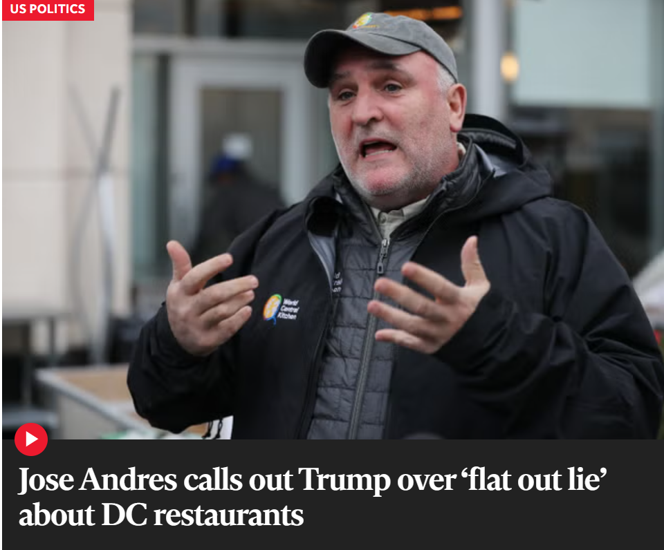 Đầu bếp nổi tiếng Jose Andres đã chỉ trích Tổng thống Donald Trump vì "lời nói dối trắng trợn" rằng một nửa số nhà hàng ở Washington D.C. đã đóng cửa do mức độ tội phạm cao khiến khách hàng sợ hãi.