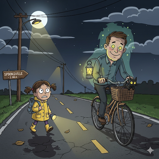 Tối nào cũng vậy, cô gái tội nghiệp cứ phải tự mình đạp xe về trên đoạn đường vắng tanh. Khỏi phải nói cô sợ ma đến thế nào!