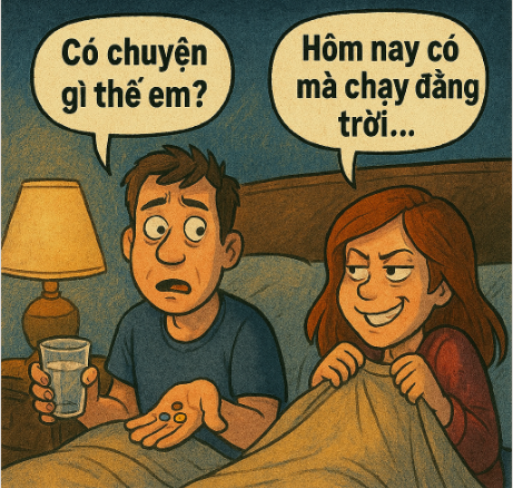 Nửa đêm, ông chồng đang ngủ ngon thì bị bà vợ lay dậy, dúi vào tay ly nước và một nắm thuốc. Ông ngơ ngác hỏi: – Chuyện gì thế em?
